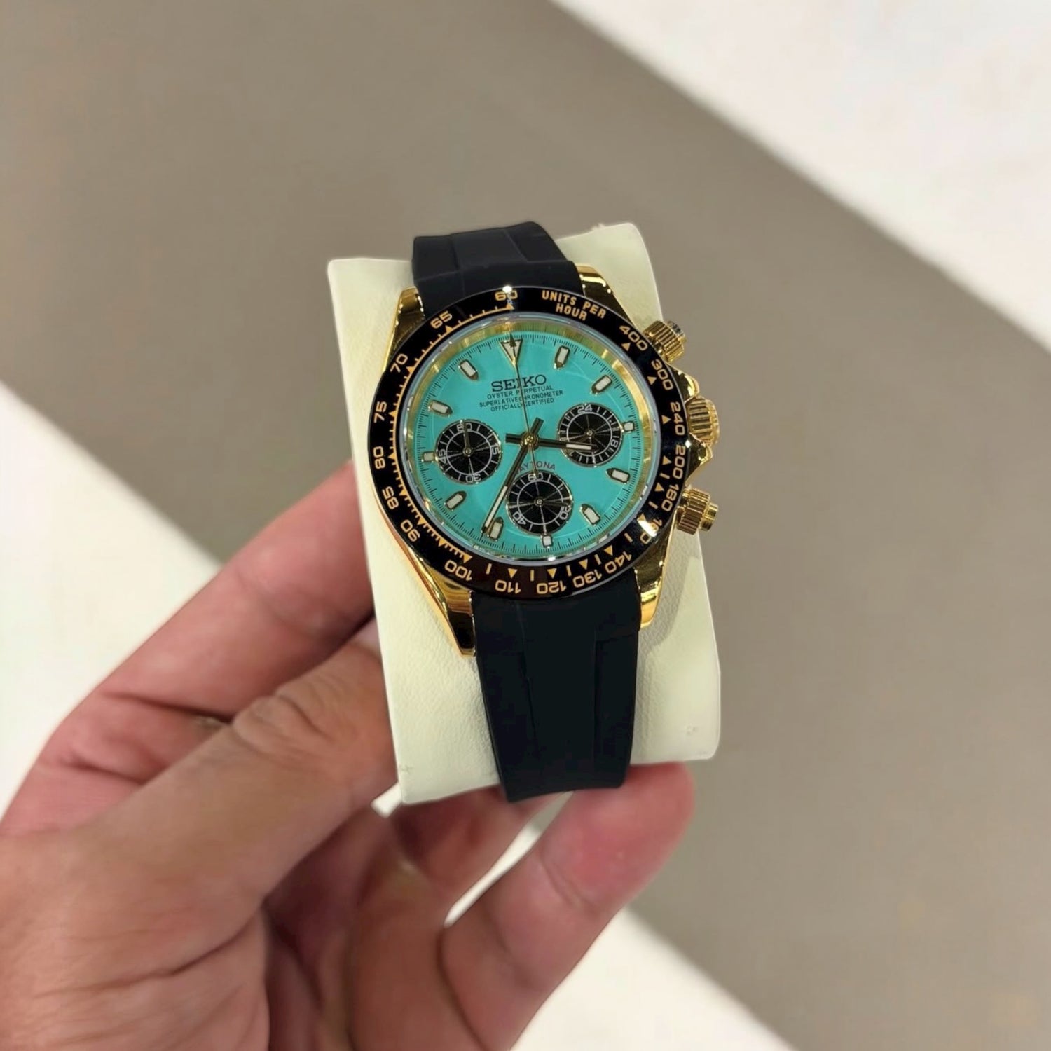 La Daytona Tiffany Blue séduit par son cadran bleu éclatant, mis en valeur par un boîtier doré et une lunette noire. Son design moderne allie élégance et caractère, tandis que son bracelet noir offre confort et style. Une montre distinctive pour ceux qui aiment se démarquer avec raffinement.